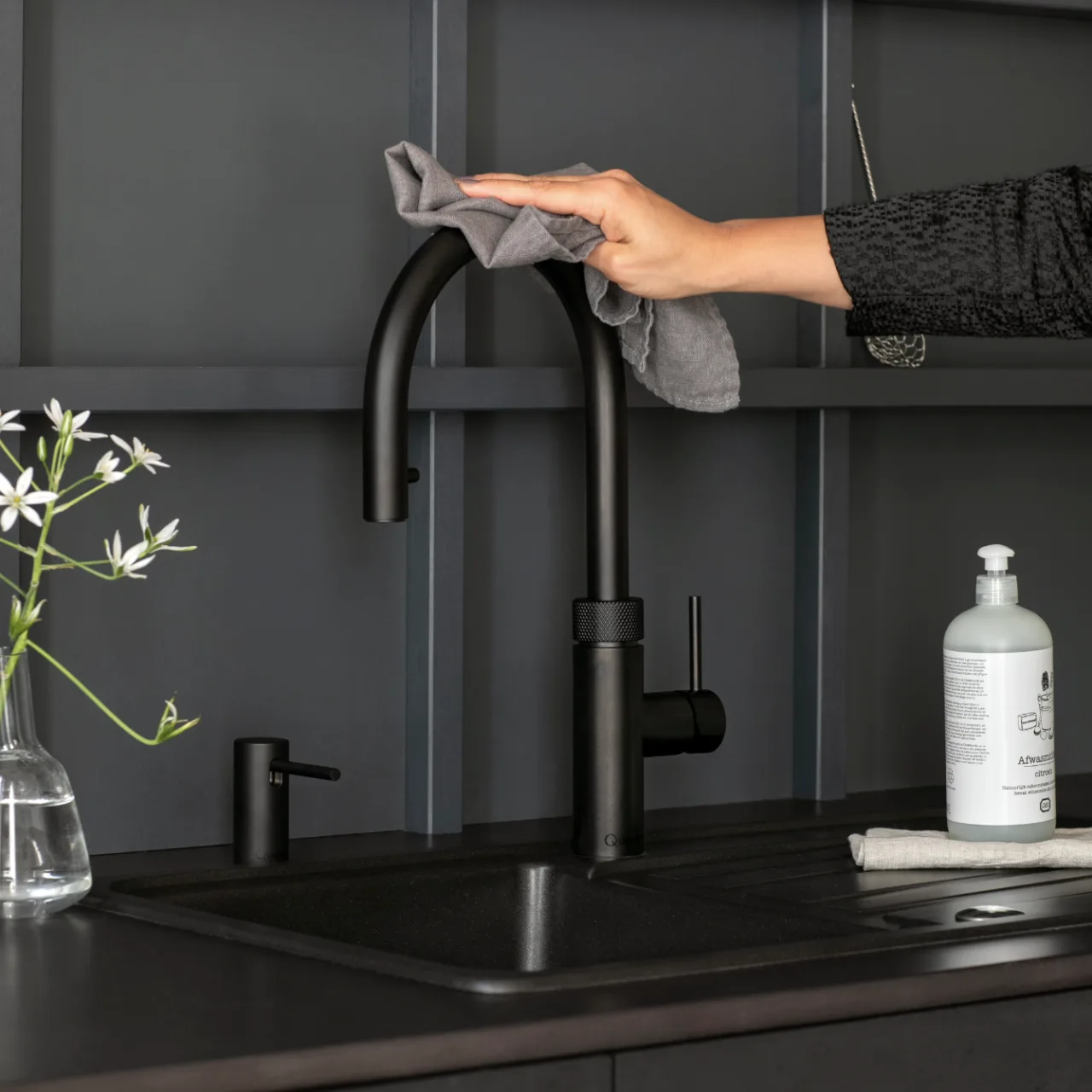 Ook de zwarte Quooker-kraan blijft op zijn mooist als je alleen warm water en een zacht schoonmaakdoekje gebruikt om hem schoon te maken. Droog de kraan na gebruik af om kalkvlekken te voorkomen. Gebruik geen schoonmaakmiddelen met een koolstofverbinding zoals isopropanol, alcohol en ethanol, deze tasten de finish aan.